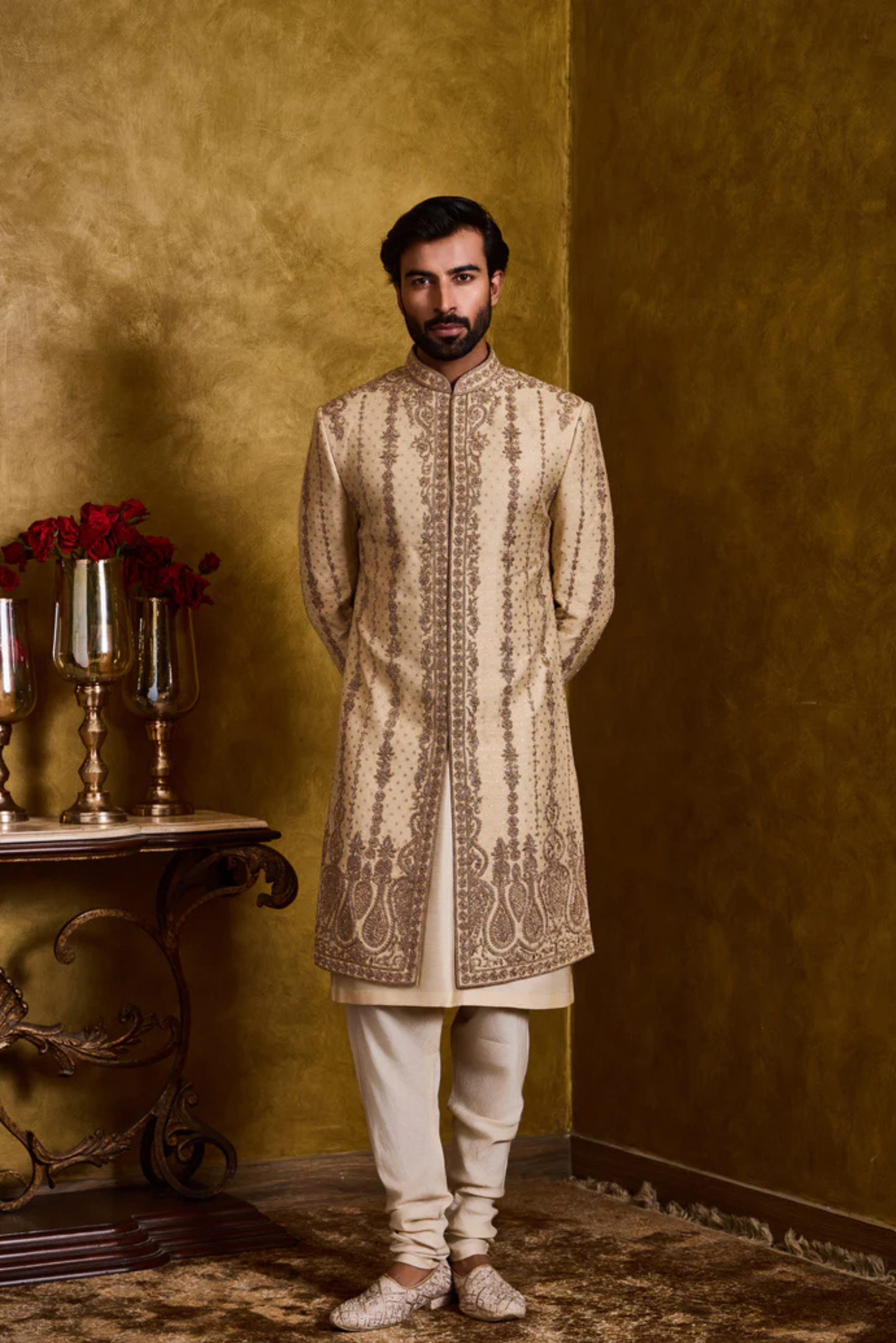 Beige Geometric Embroidery Sherwani Jacket With Salwar Set