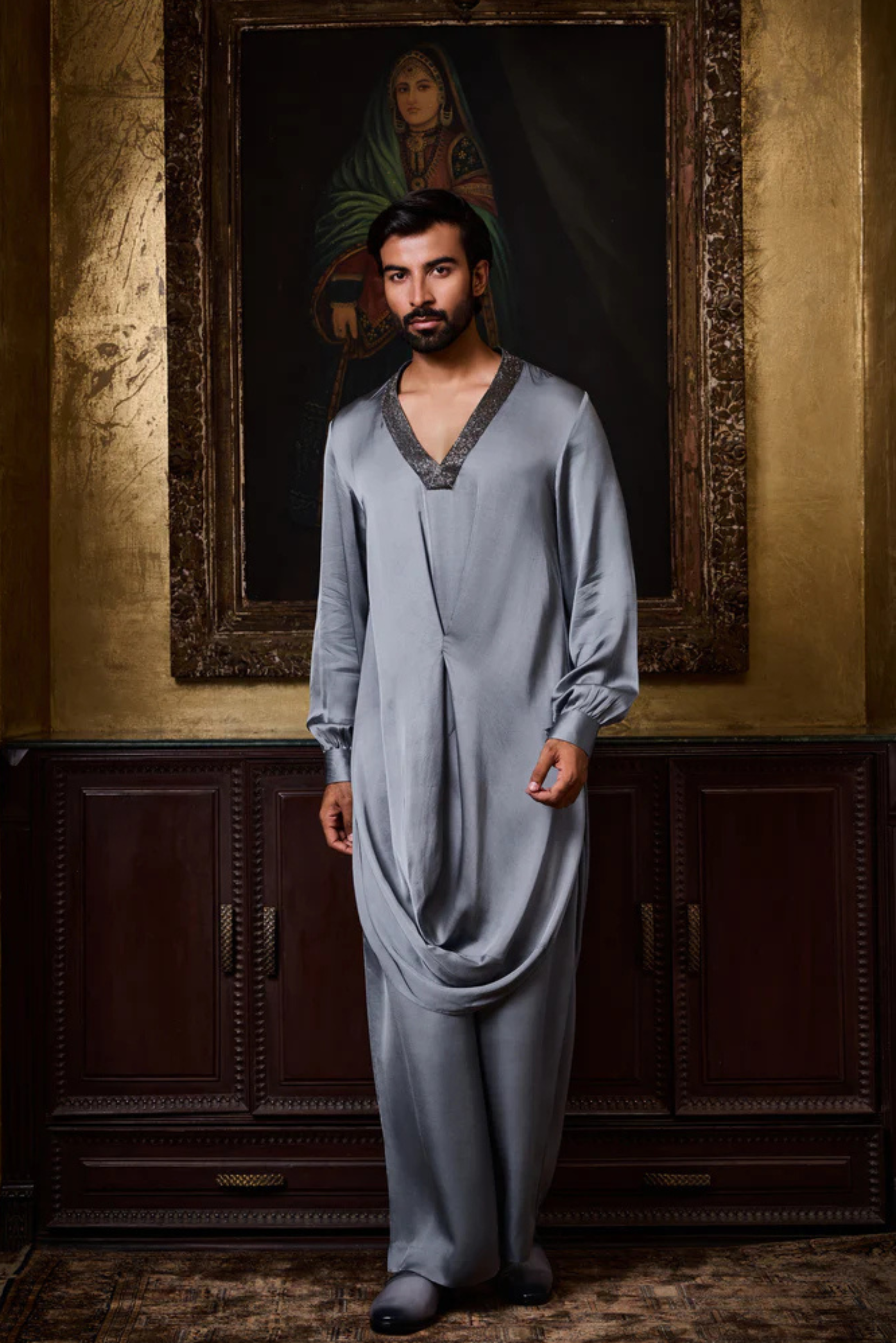 Sea Green Satin Draped Kurta Cowled Salwar Set